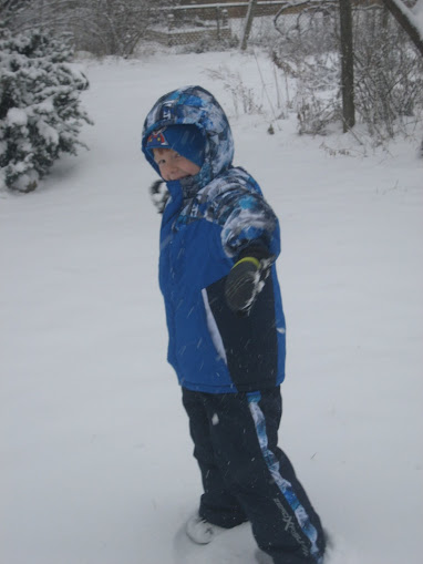 The boys and I spent the morning playing their new games. We had lots of fun playing board games. Then they went outside while I drank coffee and tried to relax. This can be difficult when everyone comes in (one after another) needing to go potty while being all bundled up in snow gear. Think A Christmas Story. I swear Aiden came in not two seconds after he walked out the door. I did spend a few minute outside taking pictures of them playing. Snowball fights were of course part of the deal
