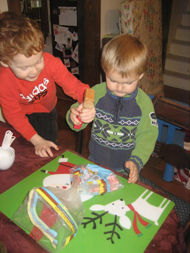 Last year I had wanted to make the boys' preschool teachers gifts for Christmas. Sadly it did not come to fruition. This year I was determined to get it done. So the day before the last day of school I sat Aiden and Cai down to work on teacher gifts in the morning.