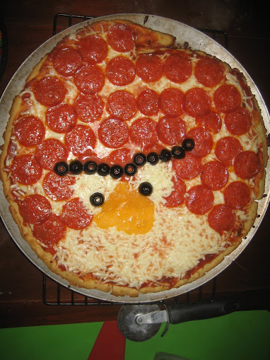 I used a gluten free crust that was given to me by friends. I then made two pizzas. One into Red and one into Chuck. Here is where I should note that at our house we know all the names of the Angry Birds. Cai bought the National Geographic Angry Birds book at Ian's school's book fair. In addition to learning about angry behaviors of birds we learn a little about all the Angry Birds. Really it's a great book. Anyhoo! I wanted to make two pizzas because I've been feeling that one hasn't quite been enough. But the thought of having 2 Red birds seemed silly. So the advantage of making Chuck is that he's yellow. Around our house people like Hawaiian pizza, well if you exclude me it's still not my favorite. Pineapple is yellow! Tada I had my second pizza. Like the pin, I used pepperoni for Red.